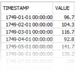 I used the monthly data, so the timestamp is the first of every month, going right back to the year 1749. The "value" column is the mean number of sunspots counted during that month.